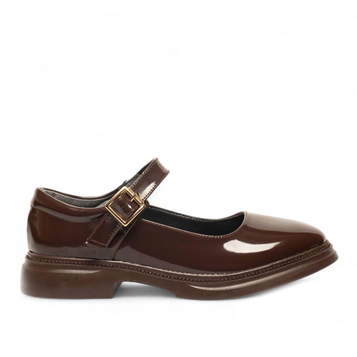 Parlak kahverengi rugan yüzeyiyle sıcak bir ışıltı sunan bu Mary Jane ayakkabı, klasik formunu güncel detaylarla buluşturuyor. Altın renkli tokasıyla feminen bir duruş sergilerken, kalın tabanı konforlu bir adım hissi yaratır.